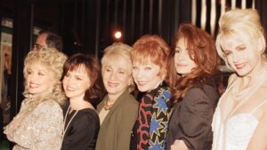 Stars of the film Steel Magnolias pose backstage at the Ziegfeld Theater in New York Nov. 5, 1989 at the movie’s premiere. Shown from left: Dolly Parton, Sally Field, Olympia Dukakis, Shirley MacLaine, Julia Roberts and Daryl Hannah. (AP Photo/Ed Bailey)