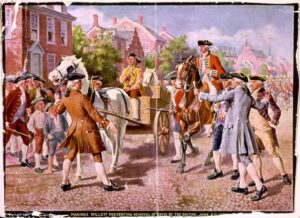 Marinus Willett preventing removal of arms by the British, June 6th, 1775 / In a print of a painting by John Ward Dunsmore, 1907. Library of Congress