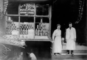 Gennaro Lombardi and Antonio Totonno Pero at 53 Spring Street. While this photo is traditionally labeled as 1905, recent evidence had been uncovered that places the year as 1908.