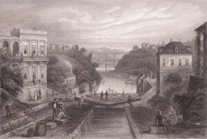 Original lithograph showing the Erie Canal at Lockport, New York c. 1855. Published for Herrman J. Meyer, 164 William Street, New York City.